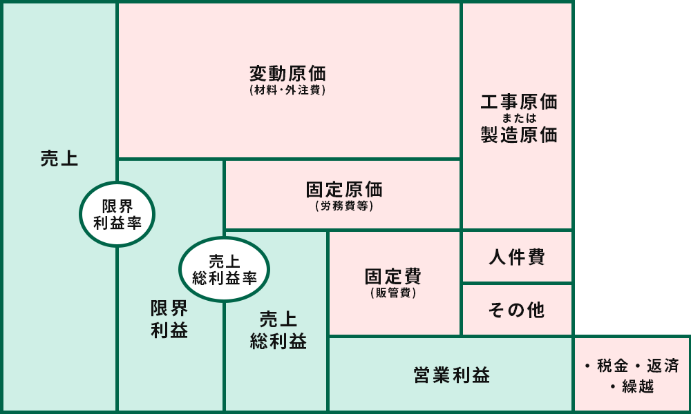 まずは、固定費や原価の見直しに着手し、営業利益が出やすい体質に改善、次に商品構成や営業展開等の戦略を立て、行動計画を実践することで売上・限界利益・売上総利益・営業利益を積み上げます。