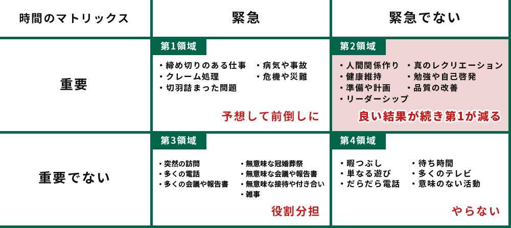 『重要だけど緊急でないこと(第2領域)』に目を向け、時間や費用を投資する。
